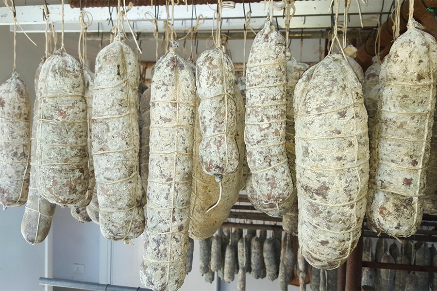 Il punto di partenza è la materia prima, che nel caso del Mangalica impone già da sola un ritmo diverso. Un suino di razza convenzionale raggiunge il peso da macello in sei o sette mesi; un Mangalica ne richiede almeno il doppio, a volte di più, perché la sua genetica non è orientata alla rapidità ma alla qualità del tessuto. Le cosce che arrivano in lavorazione sono cosce pesanti, con uno strato di grasso sottocutaneo spesso e una muscolatura densa, ricca di grasso intramuscolare distribuito in modo uniforme. È questa struttura — costruita in mesi di crescita lenta, alimentazione con ghiande e cereali freschi, movimento costante nei pascoli semi-bradi — a rendere possibile una stagionatura lunga senza che la carne si prosciughi fino all'aridità. Il grasso protegge, nutre, veicola: senza di lui, il tempo non produce complessità ma solo perdita.